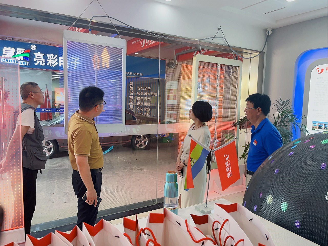 步入展廳,章總向各位領(lǐng)導(dǎo)介紹了LED顯示特色產(chǎn)品,如135寸會(huì)議一體機(jī)、球形屏、地磚互動(dòng)屏、3D屏等,包含多類不同的應(yīng)用場(chǎng)景。