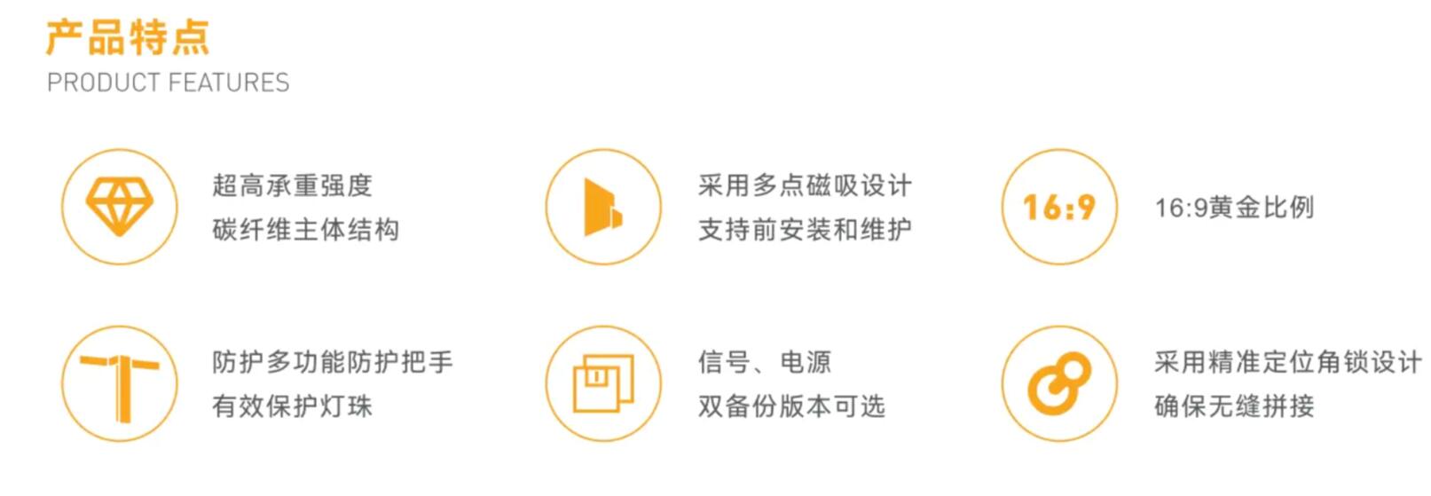 GH系列是-款標準1 6:9比例設計的室內高清全彩顯示屏,采用承重能力極強的碳纖維構,具有散熱性能卓越的特性,高灰階、高刷新率、高對比度的顯示效果。維護方便、快速,尤其適用于廣電、演播廳、影劇院等要求真實2K、4K、8K的16:9顯示尺寸場合。